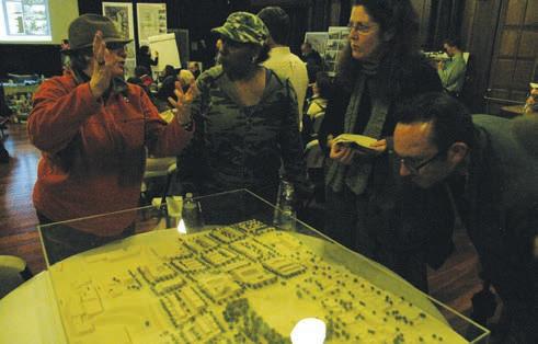 Community members examine a model of the Potrero Annex and Terrace redevelopment. Photograph by Peter Linenthal.