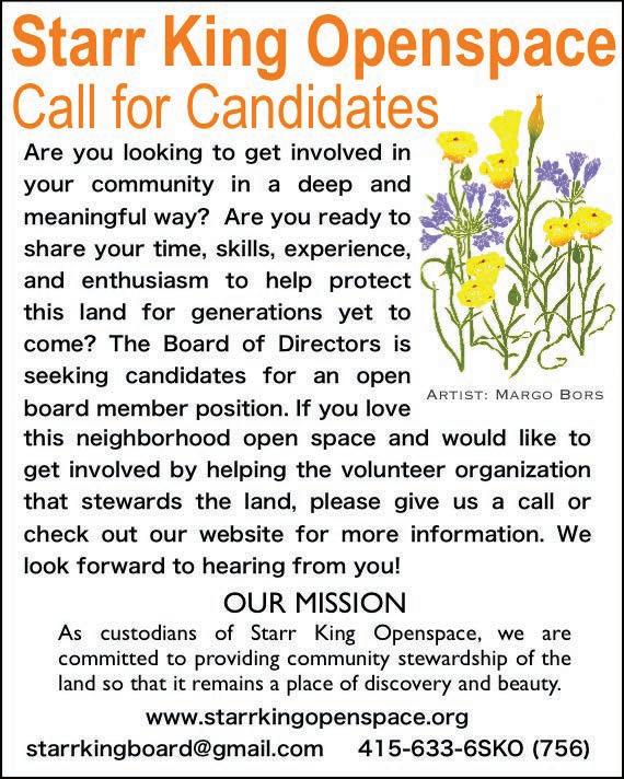 The next Starr King Openspace Board of Directors Meeting is on June 8th, location and time TBD. Visit the website for more information Board meetings are open to the public. While time will be set aside for public comment, the Board may reserve some agenda items for closed session discussion. The Starr King Openspace Volunteer Work Day is held on the 3rd Saturday of each month, excluding holidays. Meet your neighbors, get some fresh air, and come care for this unique oasis of nature in the heart of the big city. The next Volunteer Work Day is on June 19th, 9 a.m. to noon. Meet on the Openspace along Carolina Street, across from Starr King Elementary School. For more information: www.starrkingopenspace.org; contact the Board of Directors via email: starrkingboard@gmail.com; voice mail 415-6336-SKO (756).