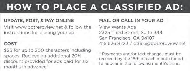Potrero Dogpatch merchants a ssociation meets the second Tuesday of each month at 10 a.m. at Goat Hill Pizza, corner of Connecticut and 18th streets. Visit www.potrerohill.biz or call 415341-8949. Next meeting: July 10th, 10 a.m.