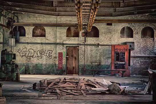 There is profound beauty in the abandoned industrial relics of our past. They serve as landmarks of former glories, hold mysterious untold stories, and remind us that we may not be as immortal as we often make ourselves believe. For the past 25 years, I’ve been surrounded by an exquisite cluster of post-industrial treasures on the central waterfront. My windows look across Illinois Street onto the ghostly deserted buildings and rusting rolling cranes of the shipyard at Pier 70. Largely frozen in time, it’s a place of indomitable magic and allure. It’s also the oldest, largest, and most intact historic industrial complex remaining on the west coast. Extensive industrial operations began here in the 1860’s. By the early-1880s the site had become a shipbuilding mecca and the City’s economic heart. During the Spanish-American War and World Wars I and II, the Yard boomed with thousands of workers who helped change history, alter San Francisco’s demographics, and contribute to the region’s economy and development. After World War II, Pier 70 experienced a long slow period of decline. Its prestige has diminished and its uses have changed over more than half a century. But the physical remnants of American industrial eminence never fully faded away. Despite its antiquated infrastructure, Pier 70’s dry docks continue to function today as the City’s most significant maritime operation. Once-magnificent offices, steely utilitarian structures and chunky machinery remain throughout the 65-acre complex, though much of these are shuttered, dilapidated and seemingly ready to buckle into the bay. Photographer Piro Patton and I recently explored the interiors of three of the shipyard’s long-vacant structures: the cathedral-like Machine Shop, built in 1886; the terra cotta-capped Powerhouse, built in 1912; and the ornate Bethlehem Steel Administration Building, constructed in 1916. They are among six historic buildings soon to be rehabilitated by Orton Development, Inc., as the centerpiece of the long-planned Pier 70 redevelopment project. After decades of vacancy and neglect — not to mention the effects of squatters, taggers and tweakers — the shadowy interiors evoke a delightfully eerie appeal, with caving ceiling tiles, dingy broken windows, volumes of graffiti, and oddly missing parts. There are surprising discoveries around every corner: an empty dining hall, a swank 120-seat movie theater, physical damage from the Great 1906 Earthquake, yellowed engineering documents from wartime ship-building projects, a fancy stone fireplace, and the stunning wood-paneled office views featured in Alfred Hitchcock’s classic film, Vertigo Photographic documentation is one small way to capture the beautifully decaying state of this once-great place. We can only hope that its gritty authenticity won’t become too polished, and lost, as it evolves into new uses. Text by John Borg Photography by Piro Patton More photos from shipyard series at Piropatton.com