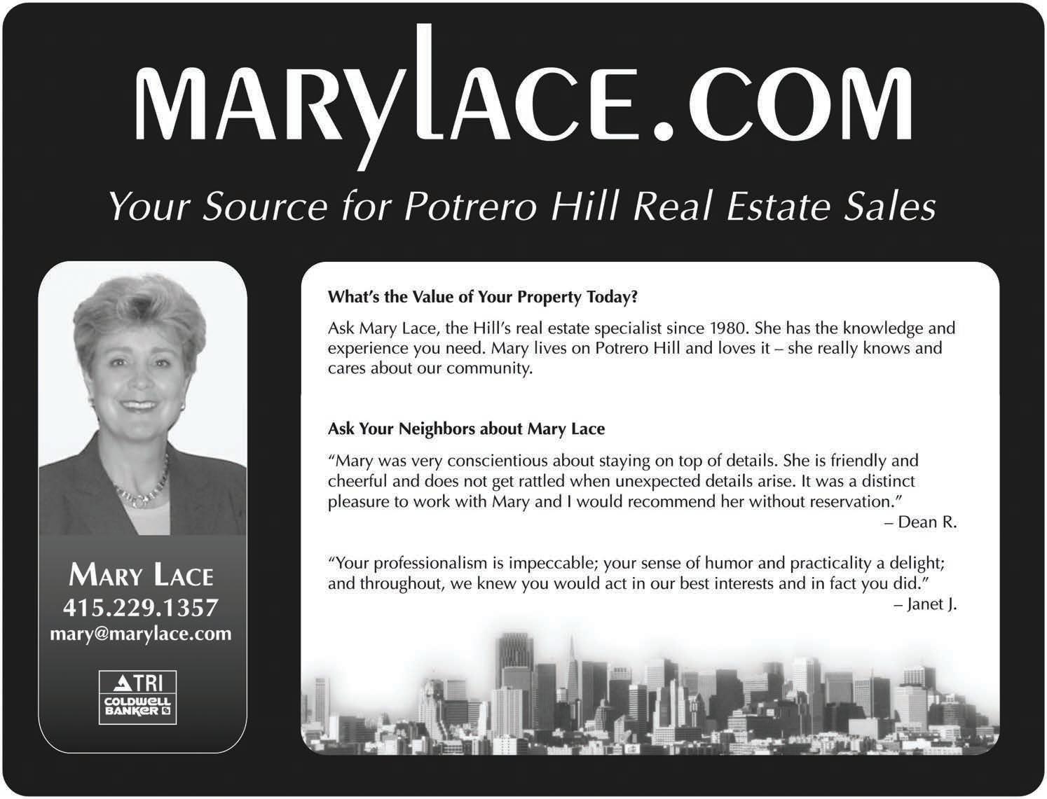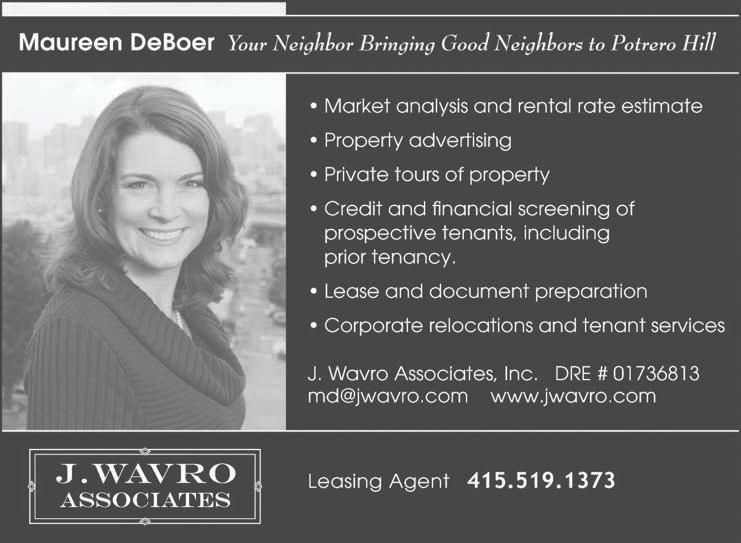 Potrero Boosters Neighborhood Association meets the last Tuesday of each month at 7 p.m. (social time begins at 6:45 p.m.) in the wheelchairaccessible Potrero Hill Neighborhood House, 953 De Haro Street. For more information: www.potreroboosters.org or email president@ potreroboosters.org. Next meeting: April 30th, 7 p.m.