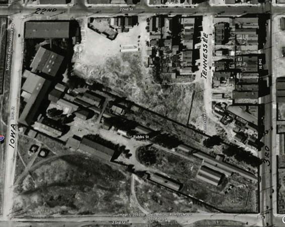 sort of industrial compound covered the area bounded by Iowa, Third, 22nd, and 23rd streets. The dominant feature was a long, thin building that sliced across what are now four City blocks, at the same angle as the current-day Hells Angels Clubhouse. In fact, the clubhouse is visible in the 1938 image, just to the north of the tilted lot, on the Third Street end.