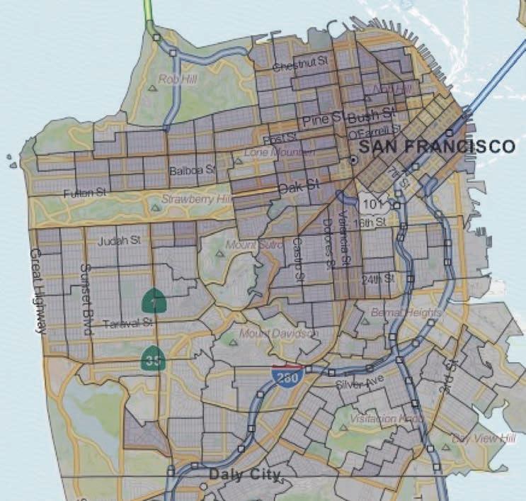 Currently, I-280 runs above the Caltrain tracks until Seventh Street. If the interstate stopped near Mariposa, SPUR envisions crossings at 16th, Irwin, Hooper, and Berry streets. Neighborhoods north and west of Mis-
