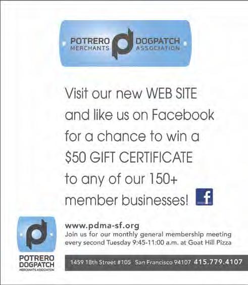 Potrero Dogpatch Merchant’s Association meets the second Tuesday of each month at 10 a.m. at Goat Hill Pizza, corner of Connecticut and 18th streets. Visit www.potrerohill.biz or call 341.8949. Next meeting: January 14th, 10 a.m.