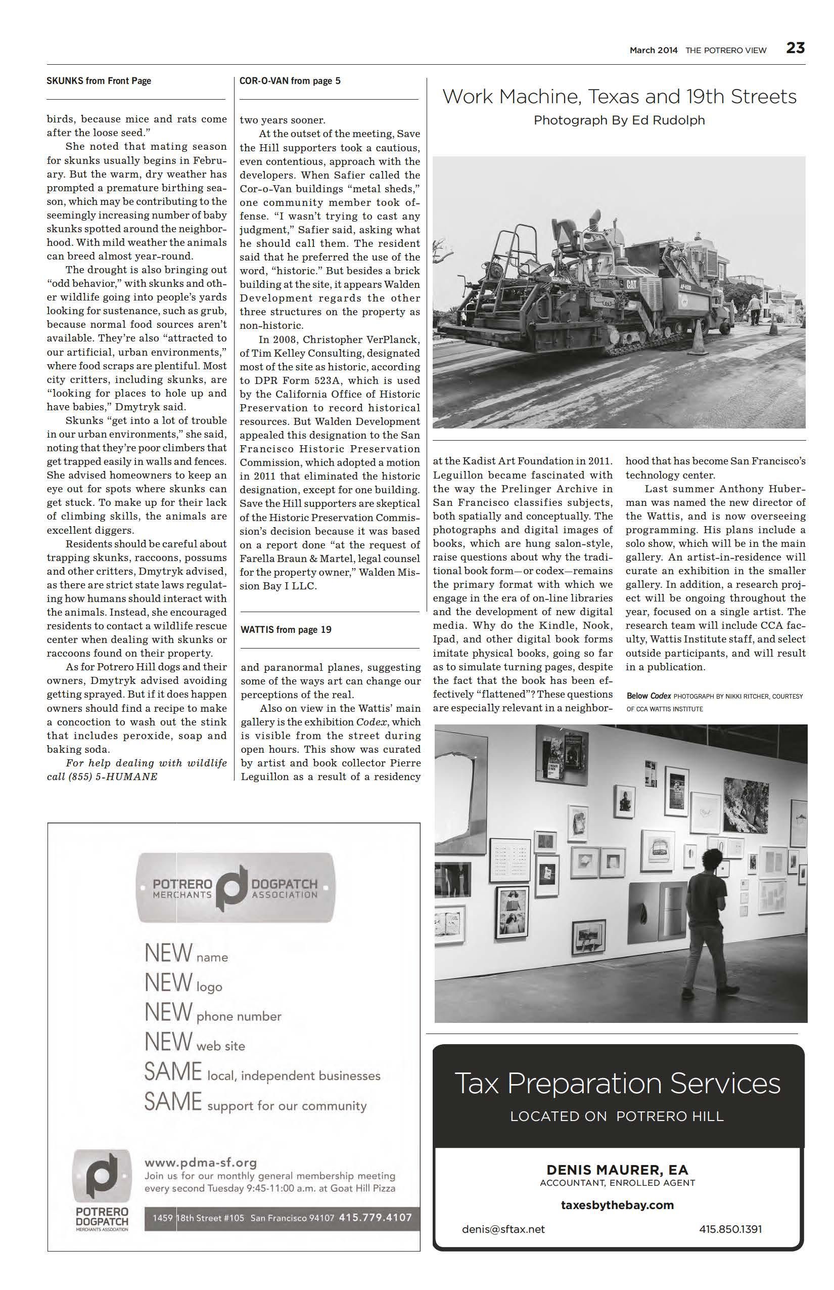 Over the past year a community of art galleries has emerged on 16th Street, Utah Street, and Potrero Avenue, with roughly a half-dozen exhibitspacesnowonoffer.Thecluster hasreplacedValenciaand16thstreets as a key artist hub, as galleries and shops in that area steadily close or move. Recent arrivals to Potrero Hill include the George Lawson Gallery , Jack Fisher Gallery , Catherine Clark Gallery, Brian Gross Fine Art, and Hosfelt Gallery. And the California College for the Arts’ Wattis Institute for Contemporary Arts and Artitud arewithinwalkingdistance.