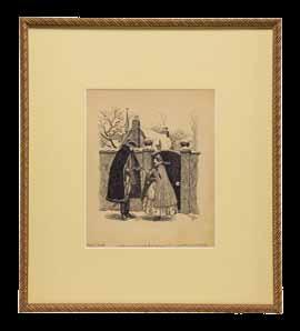 Trunk with in-use wear. 3) Uncut sheet of classical American Dolls 32¢ U.S. stamps. Appears to be 1939 Edition of 15 stamps. Housed in a molded frame under glass. SIZE: 7” x 6 1/2”; overall 13 12” x 13”. CONDITION: very good overall. 4) The Lettie Lane paper family. Framed single sheet titled “Lettie’s Sister’s Wedding: Some of the Wedding Guests” by Sheila Young. Framed under glass. SIZE: 15 1/2” x 10 1/2” sheet sight. CONDITION: very good. (05-703, 05-704/TG). $300-400.