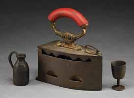 1536. RARE 19TH CENTURY IVES CAST IRON CAP GUN “JUST OUT” & 2 OTHERS. Among the rarest & most desirable of animated cap guns is “JUST OUT” manufactured by Ives Blakeslee Company, circa 1884. When gun is cocked, egg is closed. When trigger is pulled hen pecks egg and egg opens and a yellow enameled chick emerges. CONDITION: good to very good, chick retains most of its original yellow paint, body retains about 30% brown enamel. Mechanics functional. Also in lot is good unmarked double barrel cast cap gun, probably by Ives, each hammer has independent trigger and works well. Traces of enamel. Also included is 8” folding “AMERICAN BULLDOG BOOT-JACK” in shape of double barrel pistol, retains about 25% of its nickel plating. PROVENANCE: Martin Lane Historic & Western Americana Lifetime Collection. (02-21379/JS). $600-800.