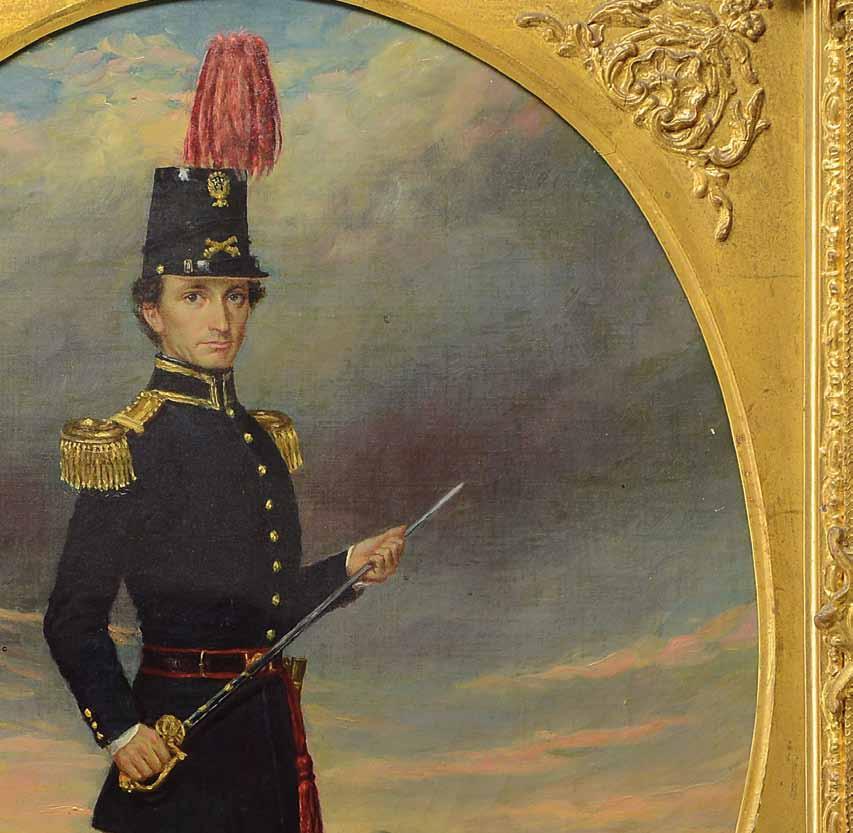 Posed with wide brimmed hat in a mililtary style formal jacket with large hunting knife and musket. Housed in a late 19th century frame, matted. SIZE: overall 37” x 31”, sight 27” x 21”. CONDITION: there is a large tear of the canvas at his left forearm. PROVENANCE: from Martin Lane Historic & Western Americana Lifetime Collection. (02-21538/.TG). $300-500.