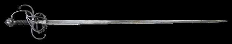 death mask of Charles I of England. There are two branches at the front of the guard and four branches to the rear. The entire hilt is covered in exceptional foliate motifs. The globular pommel is decorated with designs to compliment the rest of the hilt. Leather covered wood grip with spiraling grooves. No scabbard. CONDITION: the blade shows heavy use as one would expect. It has a cleaned light gray patina with nicks to the edge. The hilt shows overall wear but no significant damage. Grip may be an early rewrap. PROVENANCE: Estate Collection of Nicholas Apergis. (02-24732/BF). $1800-2800.