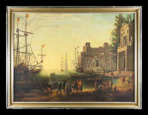 4666. AFTER CLAUDE LE (GELLEE) LORRAIN, OIL ON BOARD, “SEAPORT WITH VILLA MEDICI”. Old Master 38.5” x 29”, 42’ x 32” frame, oil on board copy, probably 19th century, of Claude Le (Gellee) Lorrain’s painting at the Uffizi, Florence. This image is famous and engravings were made as early as 1830s of this famous image originally painted in 1637. CONDITION: appears very good with no restoration, UV shows heavy yellowed varnish which layer could be cleaned to bring out more vivid colors and detail. PROVENANCE: Norm Flayderman family collection. (02-24519/JS). $2,000-4,000.