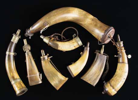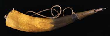 4643. EXQUISTE CONTEMPORARY CARVED “MEMENTO MORI” POWDER HORN. 15” overall, full coverage, signed DMH on edge for Douglas M. Horn. Finely scrimshawed in 18th century style: “ROBT CALLENDER / His Horn Made / GREAT MEADOWS / Ye 9th July 1775”. UNATTACHED ACCESSORIES: typed letter from Douglas Horn to consignor, making this horn in 2004. CONDITION: very fine. (02-23976/JS). NON-GUN. $600-800.
