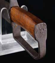 stamped in each fuller “XXX IN SOLINGEN XXX”. Iron full basket hilt with interesting irregular lineal decoration topped by a mushroom cap 4 quadrant pommel. Wire wrapped sharkskin grip with Turkshead knots above and below. No scabbard. CONDITION: blade is a bit worn with an even gray patina and the tip is somewhat rounded. Hilt is strong and undamaged. Grip may not be original but is at the hilt. The 2 fuller blade is likely of German origin and has etched decoration extending 7” up from the hilt. The etching includes stylized foliate motifs and sprays of arms. Iron full basket hilt, similar to Neumann 248.S, engraved on the largest band “ ONSLOW No 31 “ This engraving may refer to the Onslow Militia of North Carolina that was established in September of 1775 by the third North Carolina Provincial Congress. This local militia unit was involved in the American War of Independence and particularly, the Battle of Moore’s Creek Bridge and the Battle of Heron’s Bridge. It is also possible this fine sword may have been part of the royal arms belonging to the Earl of Onslow of the County of Shropshire and of the County of Surry in England. Good heavy mushroom style pommel cap with capstan. Wire wrapped grip with Turks head knots above and below.. No scabbard. CONDITION: blade is worn with a mottled gray patina. Hilt is strong but very slightly misshaped with one break in the guard. Grip has been rewrapped with iron wire in at a later date. (02-24567/BF). $4,000-6,000.