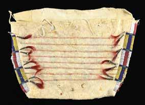 4650. EARLY NATIVE AMERICAN TEEPEE BAG. A large doe skin Native American teepee bag measuring approx. 12 1/2” x 19 1/2” at its widest point. The face of the bag has eight rows of white and faded red, wrapped quills. The edges of the bag are colorfully decorated with tightly sewn seed beads in yellow, dark blue, green, white, and red. There is a row of eight tin tinkle cones on each side enclosing dyed red horse hair. The back is plain, and the edges, of course, show similar seed bead decoration as the front. There were originally eight tinkle cones with red horse hair down the edges of the back also. The 2” closing flap has seed bead decoration in the center featuring red, white, blue, green, and yellow beads. The top of the flap has eight tin tinkle cones with dyed red horse hair. CONDITION: the body of the bag does show some staining and insect damage. There are a few sewn repairs and minor separations. The front has all of its tinkle cones intact; the back has four tinkle cones on the left, and six remaining on the right. The top flap retains all eight cones. The beaded decoration is better than 98% intact. (02-23587/BF). $3,000-5,000.