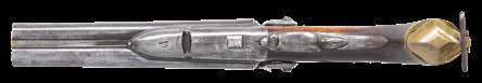 with a double fullered blade of 33 1/4” that has worn decoration and illegible words upon it. The impressive iron hilt has grotesque faces on the underside of the guard said to represent the death mask of Charles I of England. There are two branches at the front of the guard and four branches to the rear. The entire underside of the guard is covered in foliate motifs. The globular pommel is decorated with designs to compliment the designs under the guard. Wire wrapped leather covered wood grip with spiraling grooves. No scabbard. CONDITION: the blade shows heavy use as one would expect. It has a cleaned light gray patina with cleaned pitting. The hilt shows overall wear but no significant damage. Grip may be an very early rewrap. PROVENANCE: Estate Collection of Nicholas Apergis. (02-24736/BF). $1500-2500.