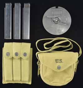 1014. FULLY TRANSFERABLE, CASED H&R M50 REISING SMG. Cal. 45 ACP. S# 114126. Bbl. 13.5” over comp. Barrel w/ 14 fins. In a search for another compact SMG as things were heating up in Europe in 1939, Eugene Reising went to work designing what we would eventually know as the Reising Model 50. He received a patent on his compact, closed bolt carbine, chambered in .45ACP in June of 1940, and entered into a manufacturing contract with Harrington & Richardson to facilitate production. It didn’t have many competitors, as the only similar firearm was the Thompson SMG, but the Reising Model 50 was extremely accurate since it fired from a closed bolt. After submission for testing with the US Army, it was not immediately accepted since its same closed bolt mechanism that provided superior accuracy had a tendency to malfunction when not cleaned and maintained regularly. Since the Thompson SMG faced a shortage, the United States Marine Corps adopted the Reising Model 50 with a parkerized finish, cooling fins, a muzzle device to assist with recoil and with select-fire capability. They then requested a modified version for the “Para Marines” that utilized a folding wire stock in a pistol grip design, and without the muzzle device. It was known as the Reising Model 55 and shared by the Tank crews. This example, the Model 50 is a select fire, closed bolt sub machine gun. It has a 20rd mag-well with 14 cooling fins and a 6 slot muzzle device. Exposed metal surfaces are finished in a smooth, even gray parkerizing. Full length wooden stock. Graduated elevation adjustable rear peep sight & drift windage adjustable front post sight incorporated into the muzzle device. Receiver is stamped on top “MODEL 50 – H.&R. REISING – CAL .45 / HARRINGTON AND RICHARDSON ARMS CO. / WORCESTER, MASS. U.S.A. PAT PENDING”. Left side of receiver punch marked “NHP” in 1/2” letters. Barrel marked w/ “Flaming bomb” ordnance mark forward of receiver. The bottom of the pistol grip has the number “3” stamped & stenciled. MAGS: 7 total mags, including 3 H&R 12rd., 2 H&R 20rd. & 3 modified 30rd. Grease Gun mags. UNATTACHED ACCESSORIES: black hard case with fitted blue felt interior, green canvas sling, vertical pistol grip . CONDITION: finish coverage complete & consistent w/ very little sign of wear in any capacity. Markings are clear & crisp. Stock has typical dings & impressions often earned in rack storage. Fire control mechanism appears to function correctly when cycled by hand. Bright bore w/ very strong rifling. NATIONAL FIREARMS