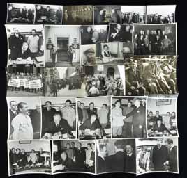 1481A. INTERESTING AND ASSORTED GROUPINGS OF UNIFORMS AND MILITARY ITEMS. Items include: 1) U.S. Cavalry stirrup w/ guidon socket. Wood stirrup is covered w/ russet leather hood. Hood is marked “U.S.” plus “JQ MD /1933 / JB” 2) 12” X 16” display tray w/ large quantity of US Officers cap badges. Most are brass colored w/ screw backs. 3) Partial box of black 1/2” 4 hole buttons. Heavy brass unmarked “SPEAR POINT FLAG POLE TIP”. 4) Cold war vintage Czech officers’ visor cap w/ “Rampant Lion” insignia. 5) 2 Soviet silver colored metal flag pole tips w/ hammer & sickle motif. 6) “East Bloc” eagle & star shoulder board. 7) U.S. WWII fiber glass civil defense helmet liner. 8) WWII U.S. Air Corps and Navy window flag for Boys in Service. 9) Black wool VFW side cap. 10) 3 flag pole holders for parade use. 1 fraternal flag holder w/ red cloth covered shoulder strap & red sash. 1 marked “JAY-PEE” & 1 unmarked brown leather. 11) Black wool coat w/ brass buttons. Brass buttons have winged rail road wheel motif & “DB”. 12) WWII uniform set consisting of: Ike jacket size 44R & battle dress trousers, size 7. 13) European military jacket OD dated 1963 & WWII Era Ike jacket w/ 6th & 7th Infantry Division patches. Size 34S. CONDITION: most items are well worn. Cloth items may have insect or rodent damage. Leather items have wear & scuffing. Most cat badges clean & bright. Helmet liner has scuffing, wear & crack in rim. (02-18191/RW). $300-500.