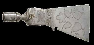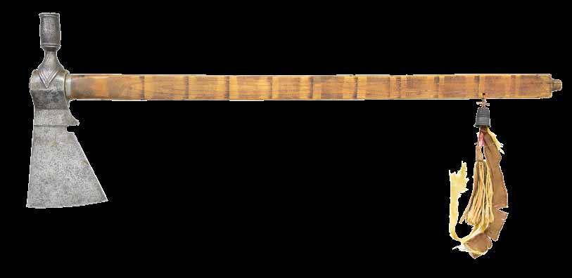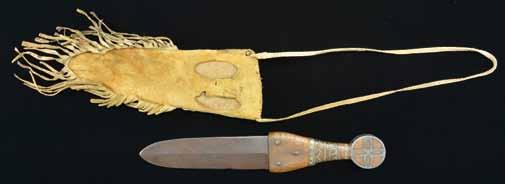 one side with dark blue, greasy yellow & green beads on light blue ground, reverse has 4 diagonals of light and blue. Row of long cone shaped shells with red trade cloth embellishments below throat, 4” beaded drop, quilled lanyard. 10” Skinning knife with curved 8” blade skinning knife. CONDITION: very good to fine overall, complete beading, about 15% quilling missing. PROVENANCE: From the Lifelong