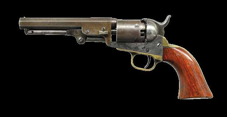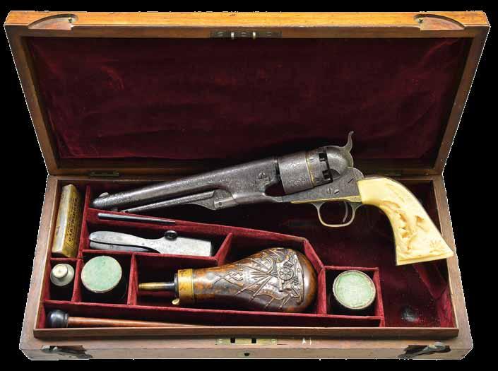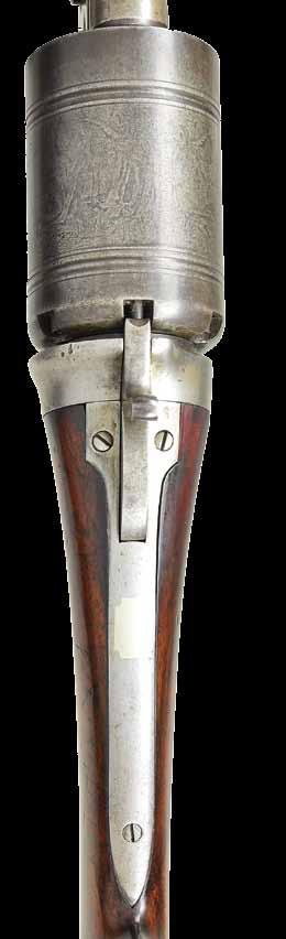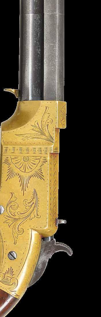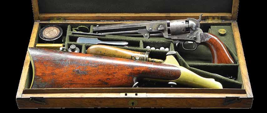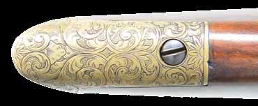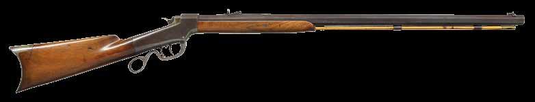 in stock trapdoor compartment. CONDITION: metal has largely faded to a pleasing brown patina retaining traces of blue in protected areas with scattered spots of corrosion. Hammer and lever retain faint traces of case colors. Unsanded wood has light coat of added finish over scratches, dents and marks. Sound action. Bore retains intact rifling showing scattered spots of pitting. (01-20195/DS). ANTIQUE. $1,500-2,250.