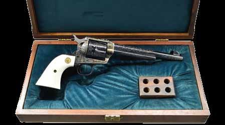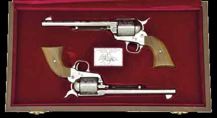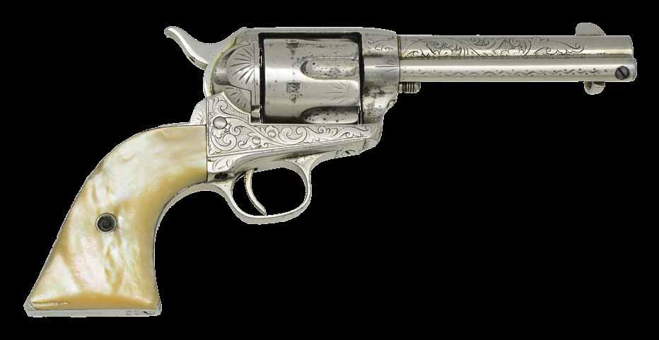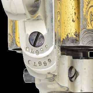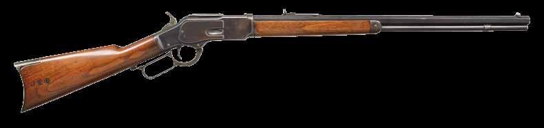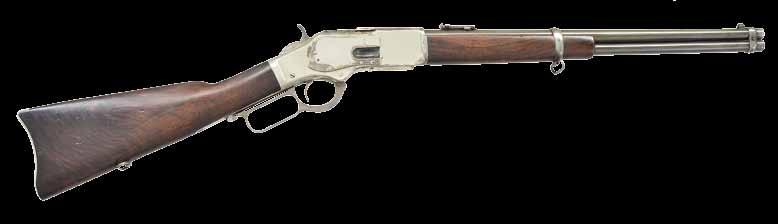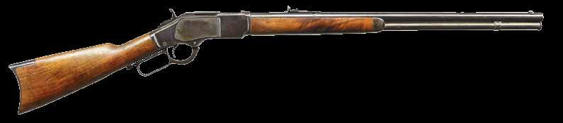 4016. REMARKABLE WINCHESTER 1873 1 OF 1000 UPGRADE LEVER ACTION RIFLE. Cal. 44 WCF. S# 28038. Possibly the finest 1 of 1000 copy ever built. This rifle deceived firearms experts, authors and collectors for decades. The quality of the alterations are so convincing that this rifle is pictured as original in “Winchester Golden Age of American Gunmaking and the Winchester 1 of 1000” by R. L. Wilson. The unscrupulous unknown builder started with a very fine case colored first model 1873 with set trigger, a very valuable rifle in its own right. He then altered the S#, added engraving, inscriptions & checkering to match the features of a real 1 of 1000 rifle. The style and quality of the engraving and inscription very closely match Winchester’s work. Under close inspection variances in the last 3 digits of the S# can be seen. This rifle was first documented and exposed as altered in 2011. The real 1 of 1000 bearing this S# is in a known collection. Barrel 24” octagon with sporting barrel sights & Vernier tang sights. Breech and muzzle ends of barrel have added engraving. Top flat has added “One of One Thousand” inscription. Case colored first model action with mortised thumb print dust cover and single set trigger. Fancy walnut forearm and straight grip stock with trap door crescent steel buttplate. Deluxe pattern hand checkering is believed to have been added. Modern sling on original swivels. UNATTACHED ACCESSORIES: 2 posters promoting the Universal-International film “Winchester ‘73” starring James Stuart & Shelly Winters. This famous movie is credited with starting the Winchester collector’s craze by doing a search for the remaining 1 of 1000 Model 73s. (1) Pictures Jimmy Stuart raising the Winchester ‘73 to his shoulder above a banner surrounded by cavalry, indians, stagecoach scenes and outlaws with Shelly Winters in the lower left corner. Bottom border has 1950 Universal Pictures Co copyright with “40084” followed by “50-408”. Image size is 39” by 24 1/2”. Frame size is 46 1/4” by 32” in an ornate hardwood frame with green matted borders. Condition is so clean & bright that it suggests a quality reproduction. (2) Depicts Jimmy Stuart hugging Shelly Winters while holding the 1 of 1000 rifle in his left hand. Upper left corner has a Delta Films S.A. trademark. Bottom edge has Spanish language markings with “V-11001964”. Image size is 38 1/2” by 25 7/8”. Framed size is 46” by 33 1/2” over an ornate hardwood frame and green matted borders. Poster is in very good condition showing some age related fading and yellowing. CONDITION: fine as altered. Barrel and mag. tube retain 70% lightly faded blue showing edge wear. Action and buttplate have over 50% dark fading case colors. Wood shows finish wear with scattered scratches, marks and grain checks. Hammer stops at half cock position when rifle is cycled with the trigger set. Bright bore retains strong rifling. (01-21713/DS). ANTIQUE. $20,000-30,000.