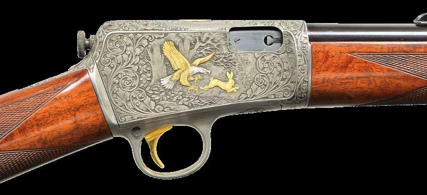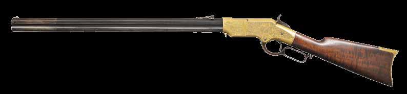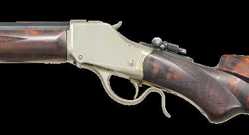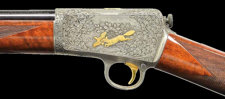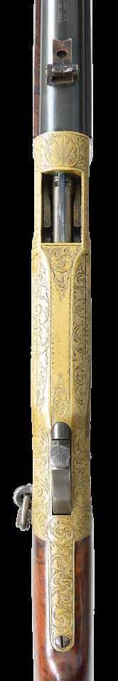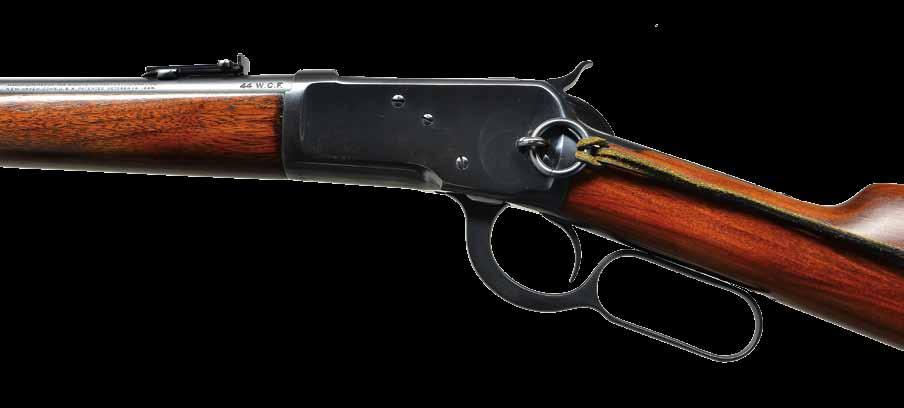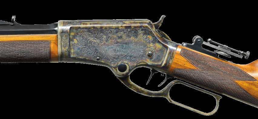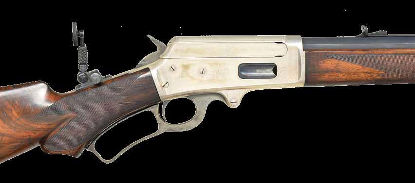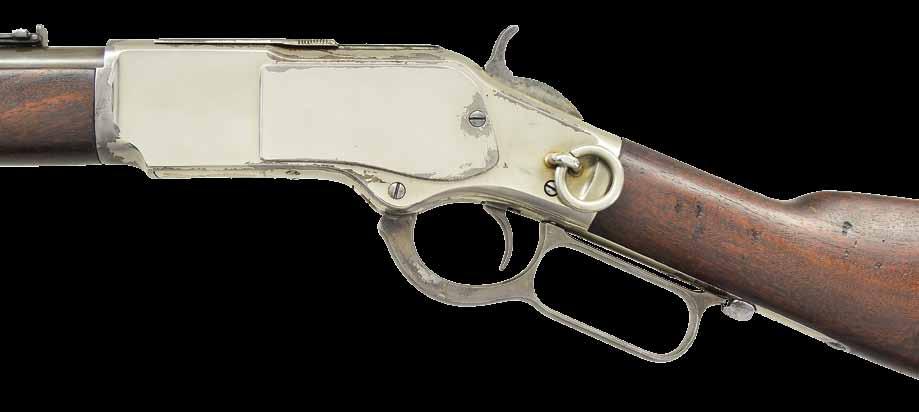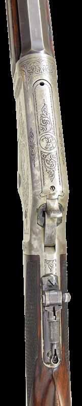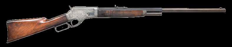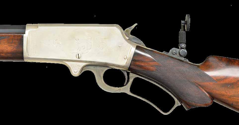 ACTION RIFLE. Cal. 30 WCF. S# 1342844. Bbl. 22” round, 4” shorter than normal. Sporting front sight with elevator adjustable sporting rear sight. Full length mag. Blue finish with case colored hammer and lever. Forearm and hard rubber capped pistol grip stock of fancy walnut have style H factory checkering and crescent steel buttplate. Forearm is standard 9 3/8” length. Left inside of lower tang is marked with assembly number “6973010” that is over stamped by 3 X’s followed by 2X wood grade marking. Left side of stock has a 2” German silver oval presentation plate engraved “L. M. Rutherford”. CONDITION: bbl., action and mag tube retain over 90% blue. Mag. band, forearm cap and buttplate have fading blue. Hammer and lever retain 70% case colors. Stock and forearm have worn original finish showing numerous scratches and marks. Bright bore retains strong rifling. (22-6405/DS). CURIO $3,000-4,500.