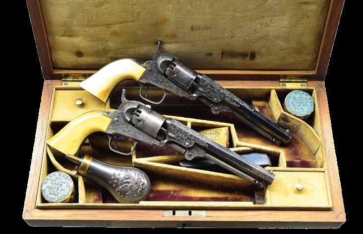 REVOLVERS. 1) 17” X 10.5” Oil painting of Colt Root revolver in display case. Painting shows case having powder flask, bullet mold, turnscrew, cap tin & lead bullets. 23” x 16.5” jointed frame. Back of frame has dark oil tag “Purchased in Philadelphia back in the 1940’s... Trompe I,oeil oil painting of a gun box ... believed to be by John Peto or William Barnett. CONDITION: frame & painting appear to be in good condition w/ moderate marks & deep gouge to bottom right exterior edge of frame. 2) Unsigned17.5” x 12.5” painting of what appears to be a Colt 1849 Pocket revolver nickel plate & engraved. Revolver is in compartmentalized case containing flask, mold, nipple wrench, cap tin, balls & bullets. 23.5” x 18.5” joint attached frame. CONDITION: frame & painting appear in good overall condition w/ wear & marks commensurate w/ age. Paint appears to have shrunk with age & has a few notable gouges. (02-17904/MD). $100-200