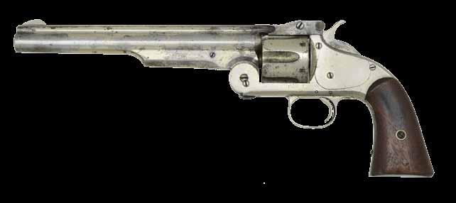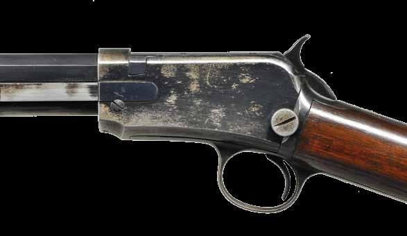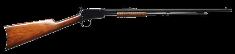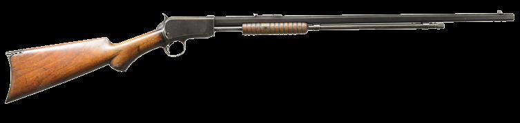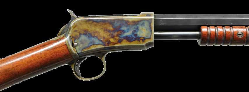 RIFLE. Cal. 22 Short. S# 804. The 1st Model 1890s featured a case colored solid frame action w/ pinned trigger guards. Approx. 15,500 solid frame rifles were produced. In 1893 the 2nd Model was introduced w/ the common takedown action. Bbl. 24 3/8” octagon, longer than the 24” bbls. of the 2nd & 3rd models. Blade front sight w/ white insert & flat top V notch rear sight. Tubular mag. Grooved walnut slide handle w/ straight grip stock having crescent steel buttplate. UNATTACHED ACCESSORIES: Cody Firearms Museum letter listing the following: “Rifle”, “22 Short”, “Received in the warehouse on February 23, 1891”, “Shipped from the warehouse on February 24, 1891”, “Returned and repaired on March 1, 1895, on June 28, 1904 on September 11, 1909”.