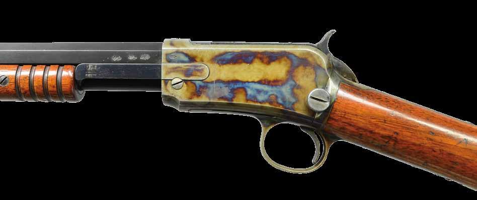 CONDITION: very fine. Receiver retains a surprising 70% lightly faded original case coloring showing scratches, small dings & dark spotting. Buttplate has faded to a dark patina retaining traces of case coloring. Bbl. & mag. tube have over 70% dull lightly faded blue showing edge & slide wear. Original wood finish shows moderate wear w/ scattered scratches & marks. Bore is lightly pitted retaining intact rifling. (01-22959/DS). ANTIQUE. $10,000-15,000.