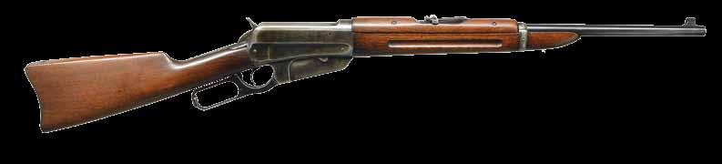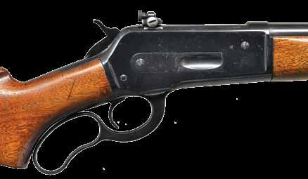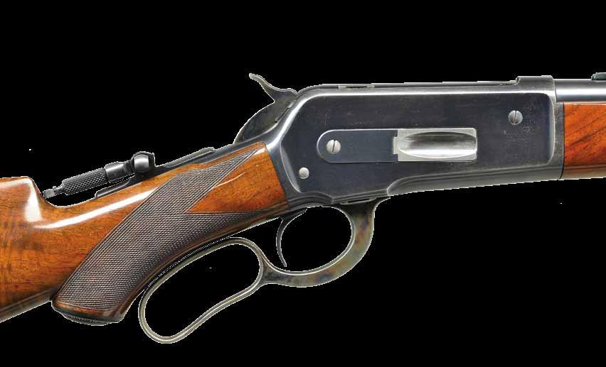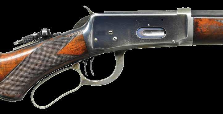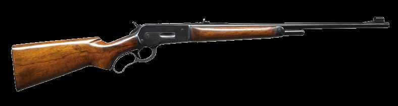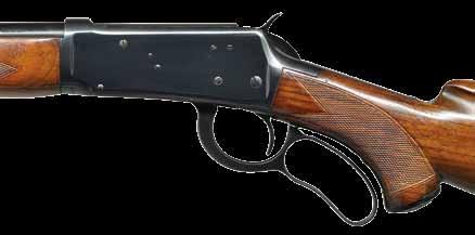 RIFLE. Cal. 30 WCF. S# 840820. Bbl. 26’’ round. Lyman gold bead replacement front sight w/ original flat top sporting rear sight. Full length mag. Walnut forearm & small hard rubber capped pistol grip stock of fancy black walnut w/ style H factory checkering & crescent steel buttplate. Left inside lower tang has assembly number “722”. Mfg. 1919. CONDITION: bbl. & mag. tube retain over 90% original blue. Action has 50% blue blending w/ areas of flaking. Original wood finish shows moderate wear w/ scratches & marks. Very good bright bore. (23-60/DS). CURIO. $4,000-6,000.