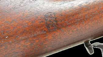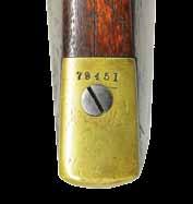 steel buttplate. 1903 mfg. CONDITION: metal retains 40% dull blue fading to brown showing scattered spots of corrosion. Wood shows heavy wear with numerous dents, scratches and marks. Sound action. Bore is generally bright with lightly worn rifling. (21-4184/DS). CURIO. $2,000-2,750.