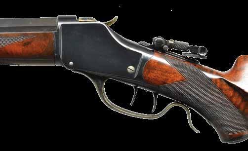 4085. WINCHESTER MODEL 1885 HIGH WALL SCHUETZEN SINGLE SHOT RIFLE. Cal. Converted to 22 rimfire from 32-40. S#. 23696. Bbl. 30” No. 3 weight of octagon to round configuration. Relined bbl. retains partial original caliber marking. Bbl. has 4 added holes with plug screws for scope block attachment. Combination front sight with ring peep and Lyman combination tang sight. Action is converted to rimfire with added nickel finish. Single set trigger. Original cheekpiece stock of XX fancy walnut features ebony insert in pistol grip, style H checkering and nickel finished Swiss buttplate. Left inside of lower tang is marked with assembly number “1660” followed by “XX” wood grade marking and “SBC”. Top tang channel stock has matching “1660” assembly number. Replacement semi Beavertail forearm of fancy walnut has extensive hand checkering. Serial number indicates 1887 mfg. CONDITION: bbl. retains 80% dull lightly faded blue showing edge wear. Renickeled action shows spots of freckling and small dents. Rifle will not fire with trigger set. Refinished stock has open grain oil type refinish. Forearm has lightly worn finish showing a few marks. Bright near excellent relined bore. (01-22100/DS). ANTIQUE. $3,500-4,500.
