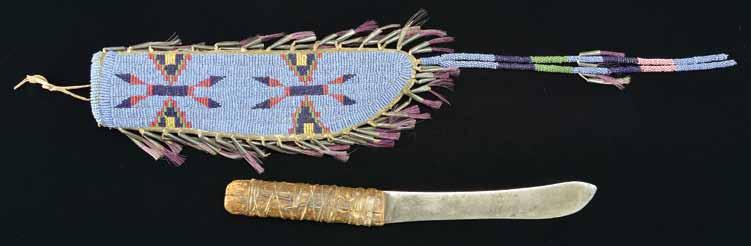 8” x 2.5”, sinew sewn, full coverage with 2 shades of green, whiteheart red, navy blue beads on a white ground, 6.5” beaded drop and 4 tinkle cones. Large 14.5” unmarked skinning knife with split wood constructed grip. CONDITION: very good overall. PROVENANCE: From the Lifelong Collection of Glen E.