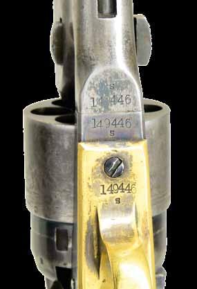 4525. 14 ASSORTED COLT PERCUSSION REVOLVER CYLINDERS. The 14 Cyls. include 5 - 31 caliber cyls.. / 4 - 5 shot cyls. / 1 - 6 shot cyl. / 5 - 36 caliber 6 shot cyls. / 4 - 44 caliber cyls. rebated Model 1860 Army Type which retain partial Colt markings. / Nipples are present in all but one cyl. which is an 1860 Army & this cyl. retains 4 nipples - 1 broken and 1 missing. The 31 & 36 caliber cyls. have no visible markings. CONDITION: cyls. have heavy wear; most turning gray w/ extensive patina. Several have been cleaned. Chambers are mostly in dark oxidized condition w/ the front edges worn w/ sm. dents. Nipples in fair to poor condition & notches may be worn &/or modified. (02-19564/RW). $250-350.