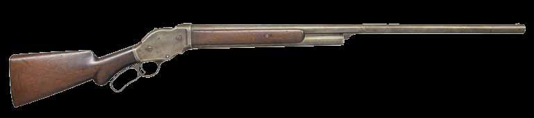 hammer, lever & crescent steel buttplate. Walnut forearm & straight grip stock. Mfg. 1899. CONDITION: bbl. retains over 80% lightly faded blue showing wear on sharp edges. Forward portion of mag. tube has gray brown coloration indicating touch up finish. Receiver shows 60% dull fading blue blending w/ areas of touch up finish. Hammer & lever show lightly visible case colors in protected areas. Buttplate has traces of remaining case colors. Wood has a light added coat of finish over moderate wear w/ numerous dents & marks. Lightly pitted bore retains intact rifling. (23-289/DS). CURIO. $1,000-1,500.