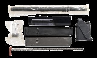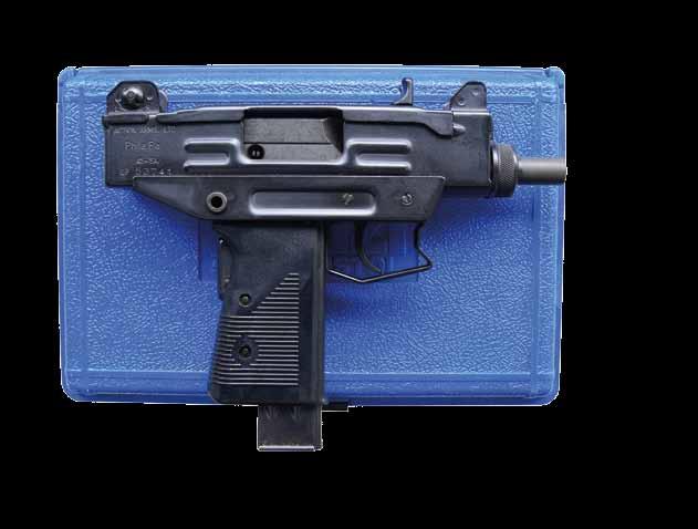 immensely. Its ratcheting top cover is an important safety factor when utilizing an open bolt mechanism. Those that are familiar w/ the 1911 family of firearms will appreciate the grip safety integrated into the mechanism. This particular example has black plastic furniture, bottom front mounted bayonet lug & sling swivels on left side of receiver & stock, currently sporting tan canvas sling. Windage & elevation adjustable, protected post front sight. Dual aperture rear sight. Left side markings “A-R-S” above safety/ selector. Left rear receiver markings “VECTOR ARMS ASL. UT / HR4332 / 9MM/45 ACP/22 / GROUP IND (inside target logo) / LOU KY 40214”. Right side receiver markings include S# 101592. MAGS: (4 total) 2 steel 25 rd. & 2 steel 32 rd. UNATTACHED ACCESSORIES: Vector Arms .22LR subcaliber kit, . UpLula pistol mag loader, CONDITION: all exposed metal surfaces are black parkerized w/ some gentle thinning in areas of mechanical intervention & a few light drag lines typical of nominal use. All outward appearances indicate this firearm has seen very little use. Stock locks tight & positive in both open & closed position. Fire control mechanism appears to function correctly when cycled by hand. Bright bore w/ strong rifling. NATIONAL FIREARMS ACT MG REQUIRING BATF TRANSFER