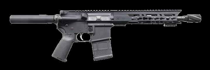 Cal. 5.56 NATO. S# 21280331. Bbl. 9” over brake. An AR-15 style pistol chambered in the traditional 5.56 NATO caliber. Barrel terminated w/ muzzle brake & matching, knurled thread protector . 7” MLOK rail w/ picatinny section providing a total of 12” of regulated rail for optic mounting. Flat top upper receiver w/ round forward assist & brass deflector. Ambidextrous charging handle. MagPul MOE pistol grip. M16 profile bolt carrier. Pistol buffer tube. Ambidextrous single point sling swivel. MAGS: 1 Gen 3 PMag 20 rd. CONDITION: All aspects indicate very little use. Bright bore w/ strong rifling. Fire