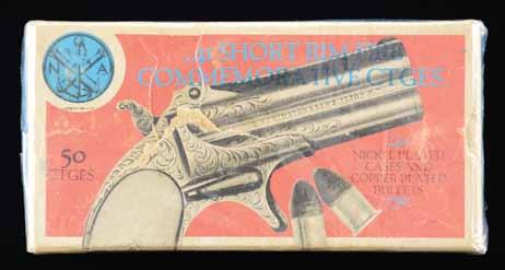 1679. FULL BOX OF NAVY ARMS .41 RIMFIRE AMMUNITION. Box of .41 Rimfire ammunition mfg. for and retailed by Navy Arms. Exterior of box is labeled for nickel plated cases and copper plated projectiles. Box contains 50 brass case lead projectile rds., headstamped “V”. CONDITION: box exhibits some exterior wear from handling and storage, with age related discoloration present overall. Ammunition is very good, with rds. appearing serviceable. (02-23280/MLW). $100-300.