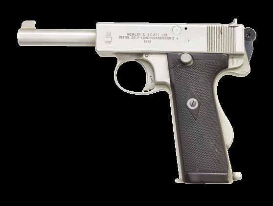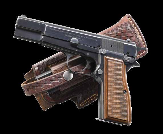 S# 2W5NX51351. Bbl. 4 5/8”. Hi-Power semi-automatic pistol, mfg. in Belgium, assembled in Portugal, and imported/retailed by Browning Arms Company. Left side of the slide is marked with Browning’s importer information, with “MADE IN BELGIUM/ ASSEMBLED IN PORTUGAL” marked on the right. Right side of the frame is marked with a Belgian commercial proof on the forward trigger guard web. Metal components exhibit a matte black finish overall. Frame is mounted with 2-piece checkered black polymer grips. 3-dot square-notch iron sights. MAGS: two 10-rd. UNATTACHED ACCESSORIES: matching factory hard case. CONDITION: near new, with metal components retaining virtually all of their original factory finish overall, with a few spots of light pitting present on the crown of the muzzle. Mirror bore, exhibiting welldefined rifling throughout. Grips are excellent overall. PROVENANCE: the estate collection of Charles Wagner. (24-4685/MLW). MODERN. $600-900.