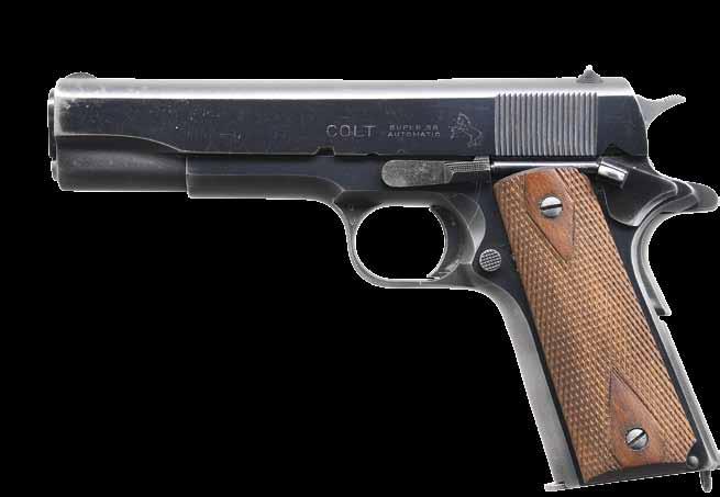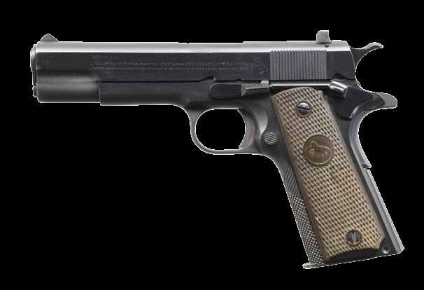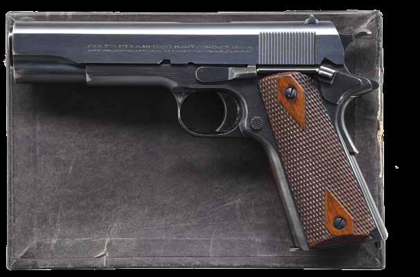 PISTOL. Cal. 45 ACP. S# C128903. Bbl. 5”. Semi-circular front sight w/ U notch rear sight. Blue finish. 2 piece diamond checkered walnut grips. MAGS: 1 detachable two-tone 8 rd. UNATTACHED ACCESSORIES: 2 piece box w/ proper label. Box contains special instructions, reprinted instruction brochure, brush & aviator’s pin. Also includes a letter from Colt Archive Properties detailing the following information, “Serial Number: C128903 / Caliber: .45/c / Barrel Length: 5” / Finish: Blue / Type of Stocks: Not Listed / Shipped To: Belknap Hardware & Mfg. Company / Address: Louisville, Kentucky / Date of Shipment: March 9, 1922 / Number of Same Type Guns in Shipment: 10”. Also includes a photo of Dorr Field, Arcadia, Florida, LT, Thomas C Taylor, seated. CONDITION: 95% blue showing edge wear. Grips show wear. Dark lightly pitted bore. PROVENANCE: From the lifelong Collection of Jim Williams. (24-2684/DS). CURIO. $1,200-1,800.