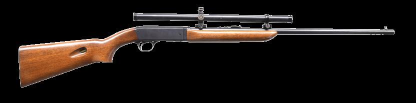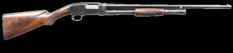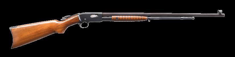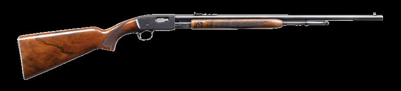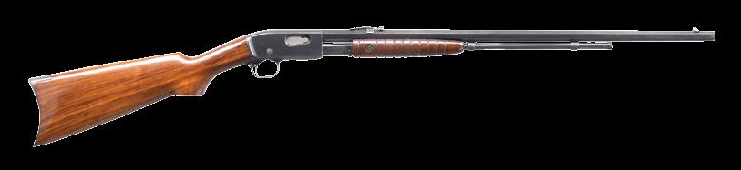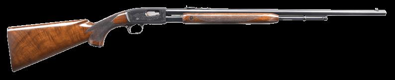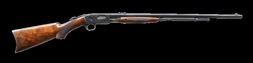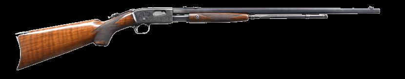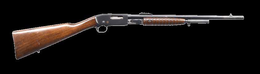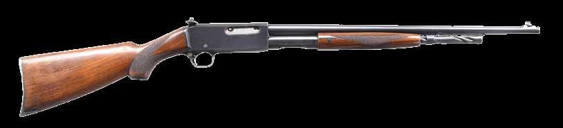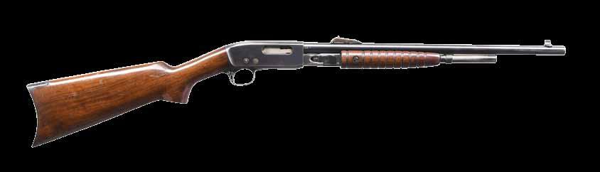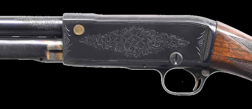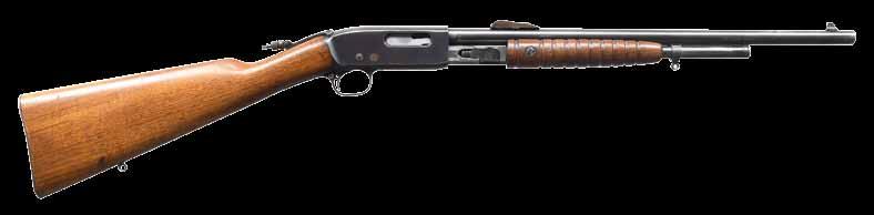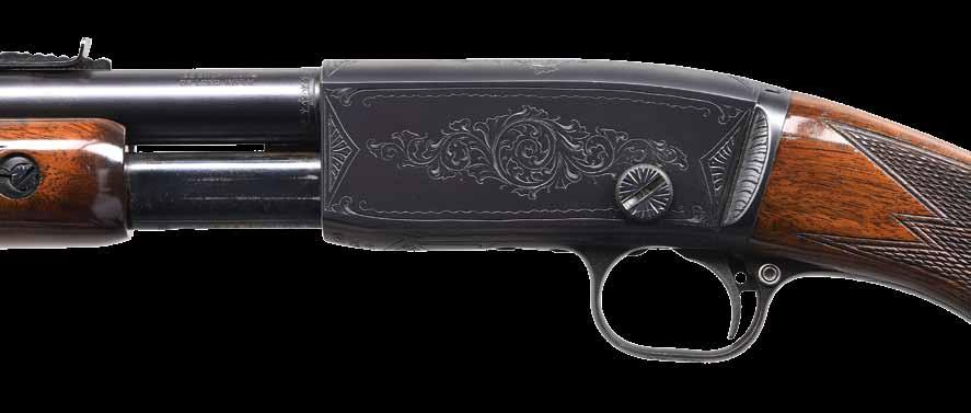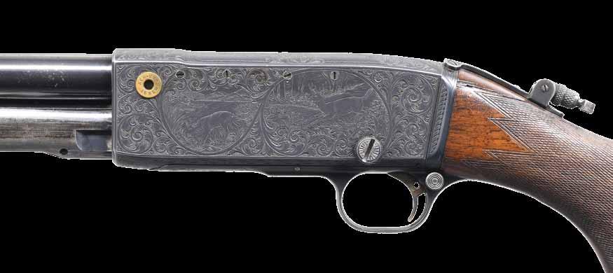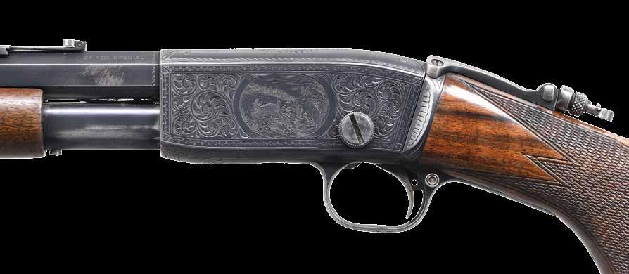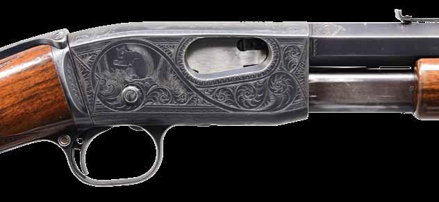 2009. RARE SPECIAL ORDER REMINGTON 12 F GRADE SLIDE ACTION RIFLE. Cal. 22 S,L,LR. S# 51921. Bbl. 24” octagon w/ standard sporting sights & special order Lyman 438-Field telescopic sight w/ standard crosshairs. F grade engraving features vignette of a squirrel on right side w/ 2 cottontail rabbits on left side. Scenes are surrounded by vine type foliate scroll & fancy borders that extend to upper & lower action areas as well as the breech end of the bbl. Forearm & rare special order straight grip stock of fancy thin shell walnut w/ crescent steel buttplate have factory F grade checkering. Mfg. 1910. CONDITION: fine, retaining over 97% blue showing small spots of freckling & light slide wear. Original wood finish shows areas of light crazing & a few small handling marks. Bore retains strong rifling. Sound mechanics. Scope has clear optics. PROVENANCE: The estate collection of Don “Duck” Combs. (24-2416/DS). CURIO. $8,000-12,000.