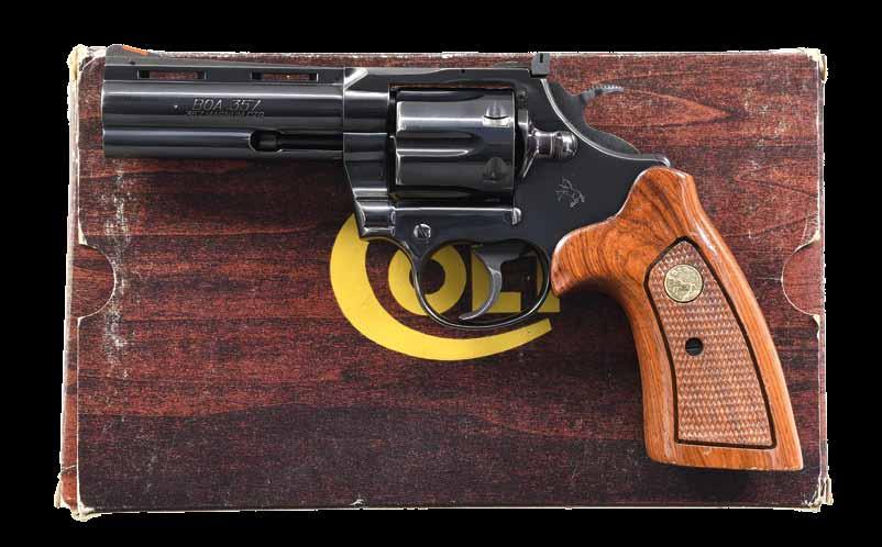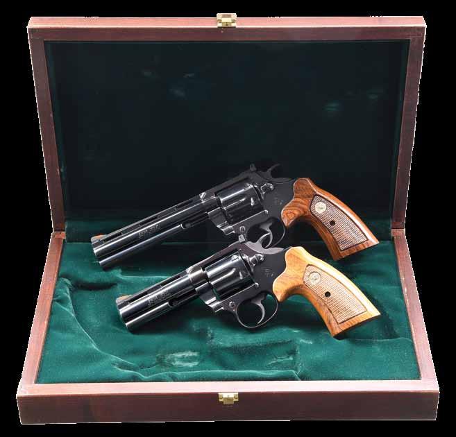 SET OF COLT BOA DA REVOLVERS. Cals. 357 Magnum. Vent rib bbls. w/ full shrouded ejectors. Red ramp front sights w/ white outline square notch rear sights. Six shot fluted cyls. Checkered rosewood target grips w/ gold rampant colt medallions. Manufactured in 1985 as a limited run of 1,200 total revolvers by Lew Horton Distribution. 600 revolvers were produced with 6” barrels with 600 being produced with 4” barrels. Only 100 cased sets were supplied by Lew Horton Distributors. GUN 1: S# BOA0115. Bbl. 4”. (24-4205/DS). GUN 2: S# BOA0116. Bbl. 6”. (24-4206/DS). UNATTACHED ACCESSORIES: presentation wood case w/ green velour fitted interior. CONDITION: both guns are near excellent retaining over 98% original finish showing slight cyl. drag lines. Bright near excellent bores. MODERNS. $50,000-75,000.