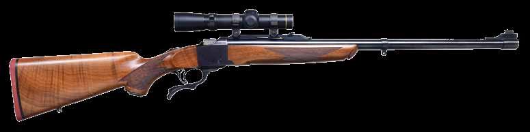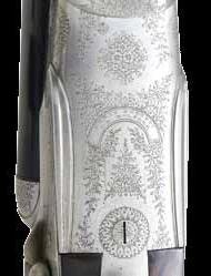 sights w/ tang sight. Action has E grade factory engraving featuring a squirrel on right side w/ 2 cottontail rabbits on left sides. Scenes are surrounded by scroll engraving w/ fancy borders that extend to upper & lower receiver areas as well as breech end of bbl. Top of action has engraved inscription “Made For / Herbert W. Hegele MD / Portland / Oregon”. Forearm & pistol grip stock of gloss finished fancy Circassian walnut. Features include point pattern hand checkering, crescent steel buttplate