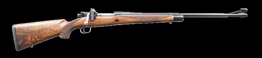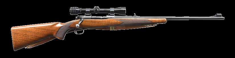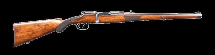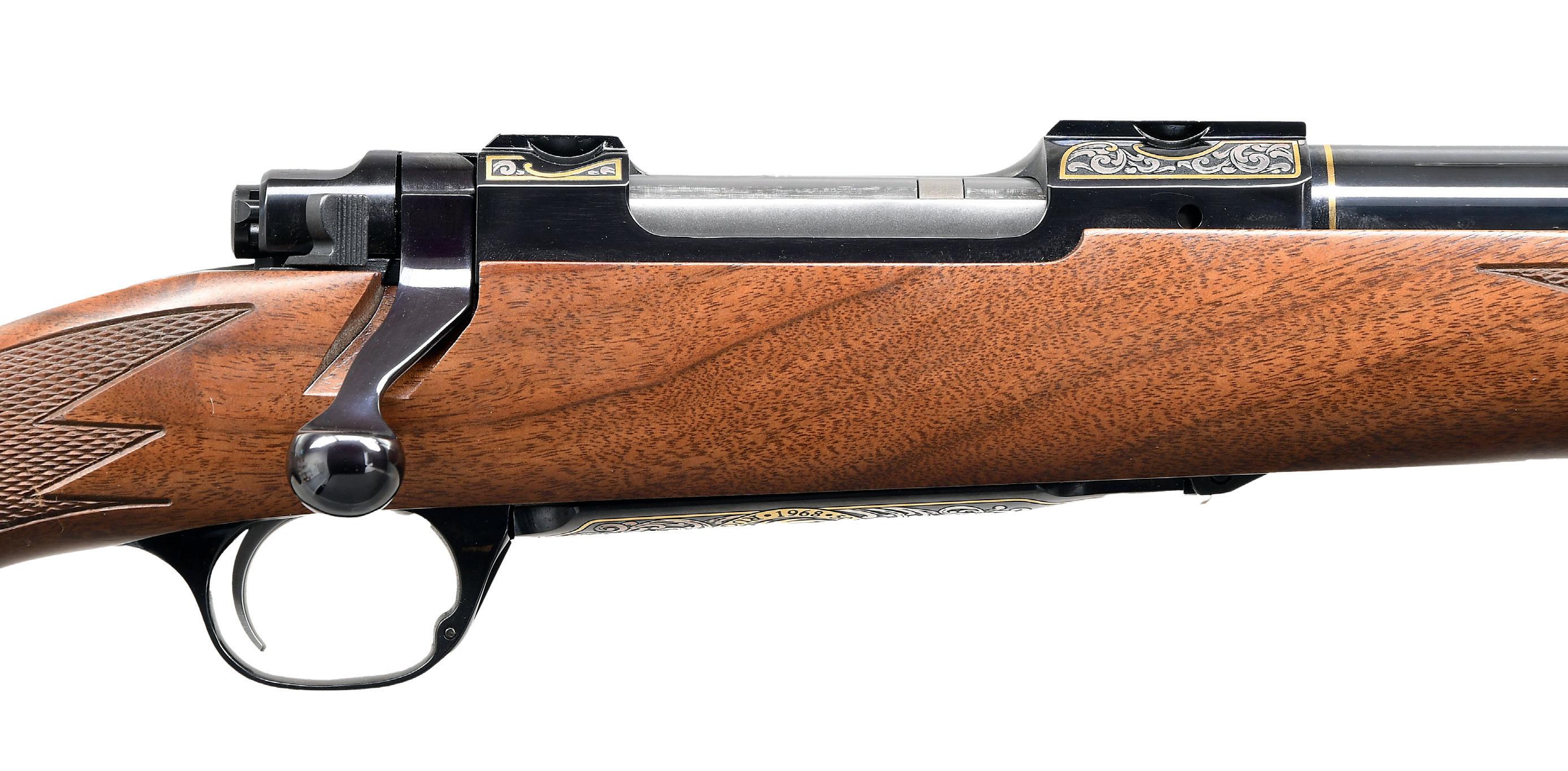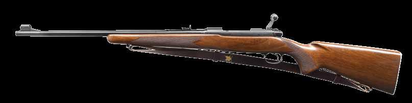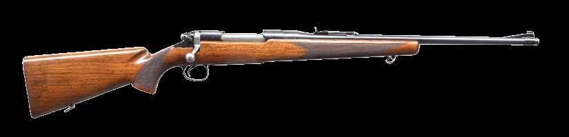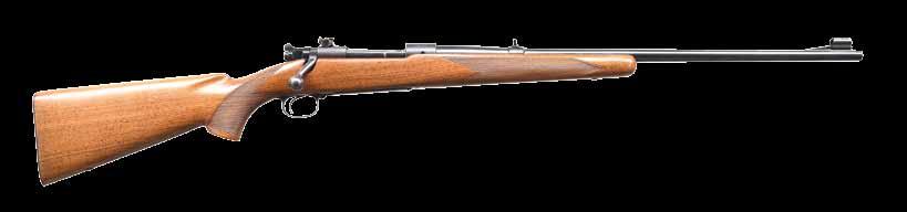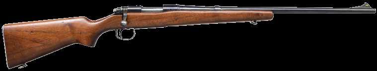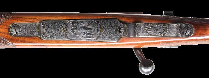 continues to the bolt handle & knob. Monte Carlo cheekpiece walnut sporter stock w/ sling swivels. Wrist & forearm have deep relief oakleaf carving. Bottom of forearm, area behind bolt & sides of stock along the action have white & black geometric inlays. Rosewood forearm tip & hard rubber gripped cap w/ white spacers. Bottom of forearm has an oval inlay w/ initials “REC”. LOP: 13 5/8” over an aftermarket Hawkins pad. MAGS: 1 detachable 4 rd rotary. WEIGHT: 7 lbs, 14.2 oz. CONDITION: over 90% bbl. & action blue. Floorplate & trigger guard have lightly worn “in-the-white” finish. Stock shows light wear w/ scattered scratches & marks having an open grain check at top of butt behind the Monte Carlo comb. Very good bore. (24-4162/DS). CURIO. $700-1,100.