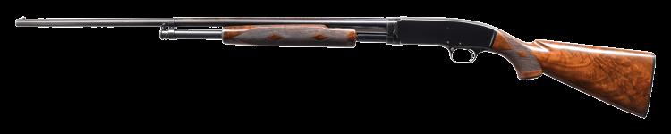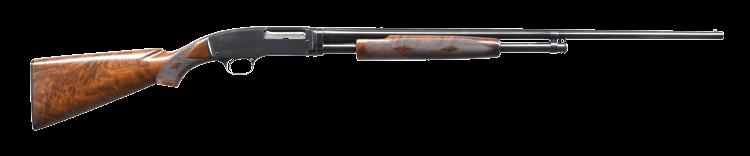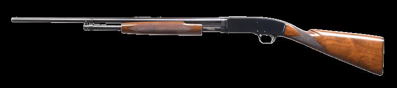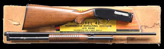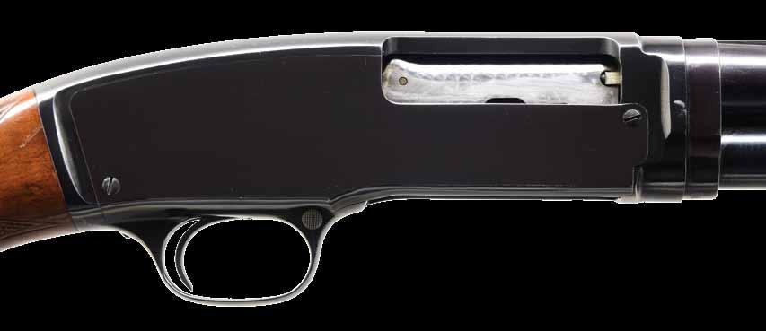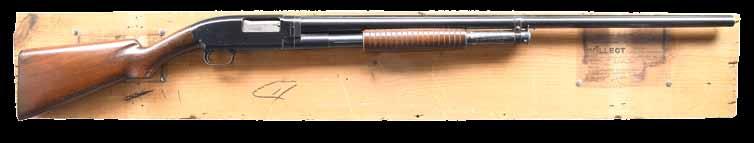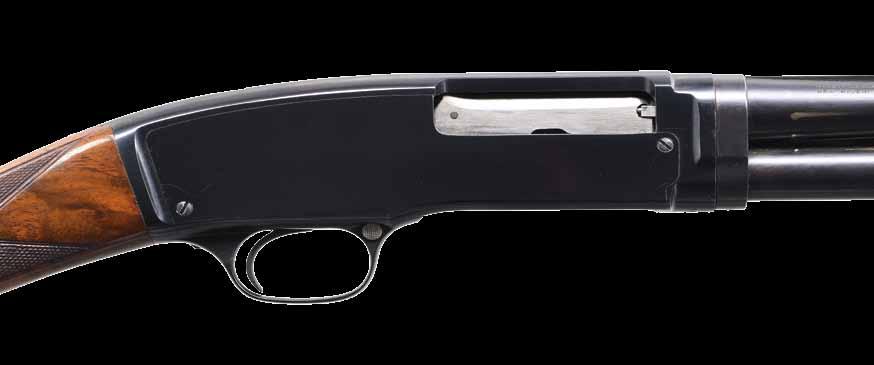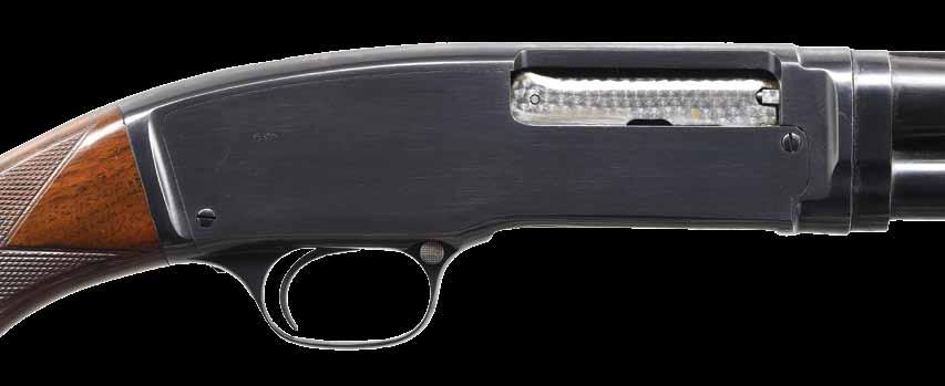 pistol grip stock of fancy walnut have gloss finish, checkered aluminum buttplate & factory point pattern hand checkering. Mfg. 1946. CONDITION: 97% original blue showing slide wear. Original wood finish shows light crazing & a few small marks. Very good bright bore. PROVENANCE: The estate collection of Don “Duck” Combs. (24-2430/DS). CURIO. $5,000-7,000.