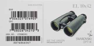EL 10x42 BINOCULARS. S# K874844047. Model 34210 with a green exterior. It comes with a matching box containing paperwork, a case, and accessories. UPC: 708026342103. CONDITION: near excellent finish, with sticker residue; clear and serviceable optics. The box is very good, with retailer stickers. PROVENANCE: the Collection of Gun Sport Ltd owned by Jon R. Thomas. (02-20684/MD). $1,000-2,000.