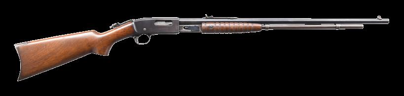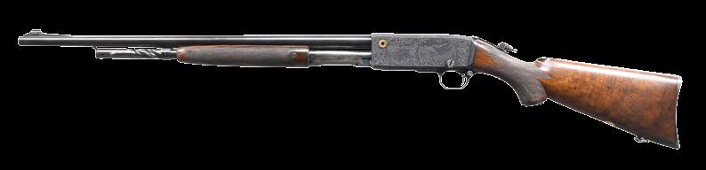 2007. EARLY REMINGTON 12D PEERLESS GRADE PUMP RIFLE. Cal. 22 S,L,LR. S# 59916. Bbl. 24” octagon. Combination front sight, sporting rear sight & Lyman tang sight. D grade hand engraving featuring a squirrel on the right side & 2 rabbits on the left side. Scenes are surrounded by scroll along w/ wavy & straight line borders that continue to upper & lower action areas. Grooved forearm & pistol grip walnut stock w/ hand checkering, crescent steel buttplate & plain hard rubber grip cap. Mfg. 1911. CONDITION: over 80% lightly worn original blue showing slide & edge wear. Original wood finish shows spots of wear w/ scattered scratches & marks. Lightly pitted bore retains sound rifling. PROVENANCE: The estate collection of Don “Duck” Combs. (24-2423/DS). CURIO. $4,000-6,000.