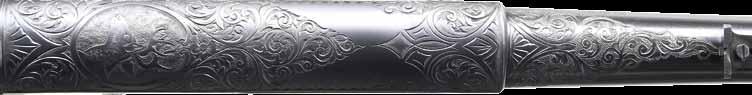 featuring a squirrel on the right side & 2 cottontail rabbits on the left. Scenes are surrounded by arabesque scroll & wavy borders that continue to upper & lower receiver areas as well as breech end of bbl. Top of receiver has portrait of a dog. Special order straight grip stock & forearm of outstanding Circassian walnut w/ hand engraving & crescent steel buttplate. Mfg. 1911. CONDITION: 90% lightly