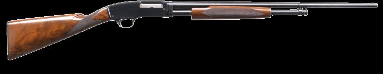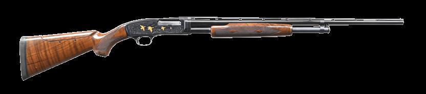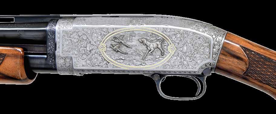 2012. SPLENDID REMINGTON 17 CARLTON ENNIS ENGRAVED PUMP SHOTGUN. Cal. 20 ga. S# 21561. This special shotgun was engraved by master engraver Carlton Ennis for his wife Elaine Bradley Ennis. F grade engraving features scenes of woodcock, pointing dogs & a mallard on the left side w/ partridge, a beagle & running rabbit on the right side. Scenes are surrounded by highlights of vine type foliate scroll w/ balance of the receiver sides being covered by a fine arabesque scroll that extends to the breech end of the bbl. Receiver top has a stippled non-glare finish. Finger groove beavertail forearm & capped pistol grip walnut stock have point pattern hand checkering. LOP: 13” over original Remington buttplate. Bbl. 25” solid rib w/ factory installed alloy cuts compensator & spreader tube. White target front sight w/ steel mid bead. UNATTACHED ACCESSORIES: hand written letter from Paula Ennis Burns dated September 14th, 2011 detailing the following information, “I am Paula Burns, the only daughter of Carlton (Carl) Ennis of Ilion, N.Y. My father was a master engraver for Remington Arms Company. He engraved a model 17 shotgun, 20 ga, serial number 21561 for a gift for my mother Elaine Bradley Ennis. My mother used the gun to go hunting and shooting at the Ilion fish & game club. I received the gun after her death.” CONDITION: gun retains over 90% originally blue showing slide & edge wear. Very good original wood finish shows small scratches & handling marks. Sound mechanics. Very good bright bore. PROVENANCE: The estate collection of Don “Duck” Combs. (24-2499/DS). CURIO. $4,000-8,000.