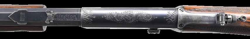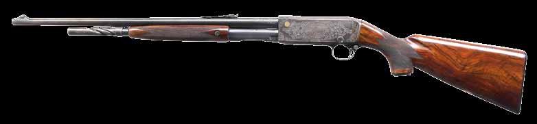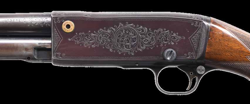 PEERLESS D GRADE PUMP RIFLE. Cal. 22 Rem Spec. S# 226100. Bbl. 24” octagon. Original bead front sight, filler in rear dovetail w/ Lyman tang sight having a large disc aperture. Blue finish. Action has factory D grade engraving. Right side vignette features a squirrel on a branch. Left side vignette features 2 cottontail rabbits. Scenes are surrounded by scroll engraving w/ fancy borders that extends to upper & lower action areas. Grooved forearm & hard rubber capped pistol grip stock of fancy walnut w/ hand checkering & crescent steel buttplate. Mfg. 1913. CONDITION: 90% lightly faded blue showing carry wear w/ spots of freckling. Original wood finish shows wear spots & darkening w/ scattered scratches & marks. Bright bore retains lightly worn rifling. PROVENANCE: The estate collection of Don “Duck” Combs. (24-2424/DS). CURIO. $5,000-7,000.