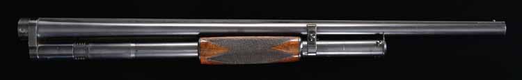 Complete 20 ga. bbl. assembly used in factory as a pattern model. Bbl. is 25” of nickel steel w/ solid rib. Left side at breech has Winchester proof mark / 20 / 2 3/4” over FULL over an added IMP MOD. Headspace ring is stamped “NS / 20 G”. Receiver extension is stamped “3.S.”. Small round walnut forearm w/ trap style wraparound checkering. CONDITION: over 95% original blue showing slide wear w/ small scraps on headspace ring. Forearm has very good original finish showing a few small marks. Bright bore. PROVENANCE: The estate collection of Don “Duck” Combs. (02-22854/DS). NON-GUN. $1,000-2,000.