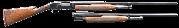 2746. GROUP OF WINCHESTER MODEL 42 & MODEL 12 BBLS. & PARTS. MODEL 42 BBLS. & PARTS. All cal. 410, 3” chambers, having standard “WP” proofmarks. No. 1: 28” plain w/ fixed full choke & steel bead. Bottom of bbl. is dated “47”. CONDITION: near excellent, appears unused. No. 2: 28” plain w/ fixed mod choke & steel bead. Bottom is dated “53”. Condition is near excellent, appears unused. No. 3 is 28” plain w/ fixed mod choke & steel bead. Bottom is dated “39”. Near excellent, appears unused. No. 4 is 28” plain w/ fixed skeet choke. Front sight hole is open. Bottom is dated “43” . CONDITION: near excellent appears unused. No. 5 is 24” plain w/ fixed mod front choke & steel bead. Bottom is dated 37. CONDITION: very good used retaining 98% blue. Very good bright bore. No. 6 plain shortened to 23 1/2”. Reattached front bead. Original choke marking was full. Bottom is dated 33. 97% blue. Very good bore. No. 7 & 8: two stripped mag. tubes. CONDITION: 1 retain 90% bead blasted finish. The other retains 50% lightly polished reblued finish. MODEL 12 BBLS. & PARTS. No. 1: complete 12 ga. bbl. assembly. Bbl. is 28” solid rib of nickel steel w/ fixed mod choke & steel bead. Small round grooved forend. Bbl. extension is serial number 331547. CONDITION: 80% blue showing spots of corrosion & light pitting w/ flaking on extension. Forearm has white finish. Very good bore. No. 2: Model 1912 12 ga. 30” plain w/ fixed mod choke & early bead. CONDITION: 70% showing spots on corrosion. Very good bore. No. 3: Model 12 trap grade extension walnut forearm & 3 panel checkering on slide bar w/ a stripped mag. tube. Metal parts retain 50% blue. Finish in checkering wear showing numerous scratches, marks & small dents. PROVENANCE: The estate collection of Don “Duck” Combs. (02-22863/DS). NON-GUN. $1,200-1,800.